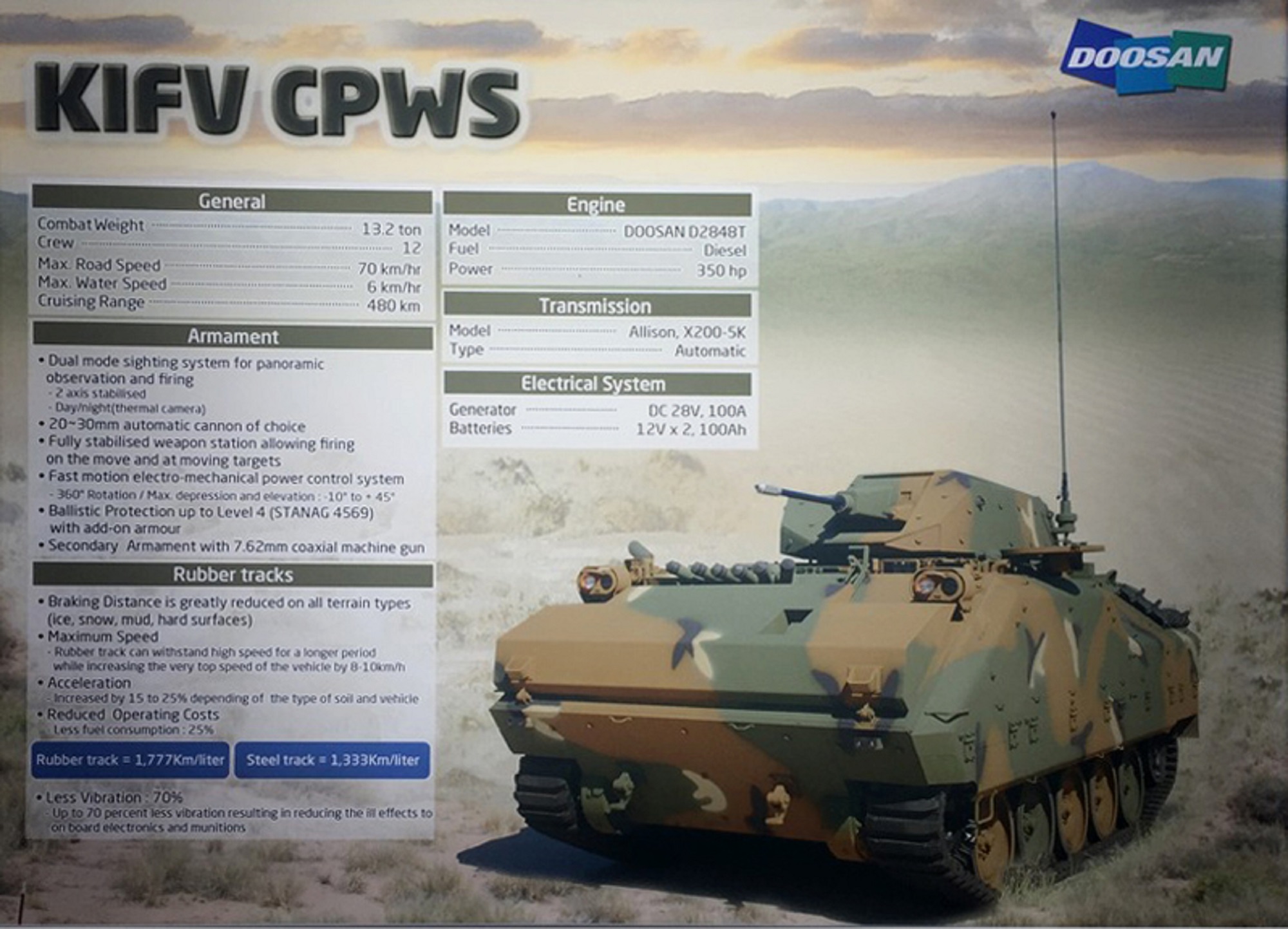 - Ενδιαφέρον έχει επανειλημμένα εκδηλώσει και η νοτιοκορεατική Hanwha Defense, χωρίς ωστόσο να ανακοινωθούν λεπτομέρειες ως προς το τεχνικό σκέλος της πρότασής της. Κατά πάσα πιθανότητα θα βασίζεται στην εμπειρία της εταιρίας από την ανάπτυξη, παραγωγή και αναβάθμιση της σειράς Κ200 KIFV, ειδικότερα τον εκσυγχρονισμό στο επίπεδο Κ200Α2 με κάμερες επιτήρησης εμπρός και πίσω και βελτίωση της θέσης του οδηγού με νέα συστήματα, ενώ θα πρέπει να θεωρείται σχεδόν δεδομένη και η χρήση απαρτίων από το KIFV CPWS που παρουσιάσθηκε το 2015 και ενσωματώνει, πλέον – προφανώς – του τηλεχειριζόμενου σταθμού οπλισμού CPWS της βελγικής John Cockerill, ισχυρότερο πετρελαιοκινητήρα Doosan (πλέον Hanwha) D2848Τ συζευγμένο με αυτόματο κιβώτιο ταχυτήτων Allison X200-SK, και πρόσθετη θωράκιση για συνολική προστασία έως επιπέδου 4 STANAG 4569.