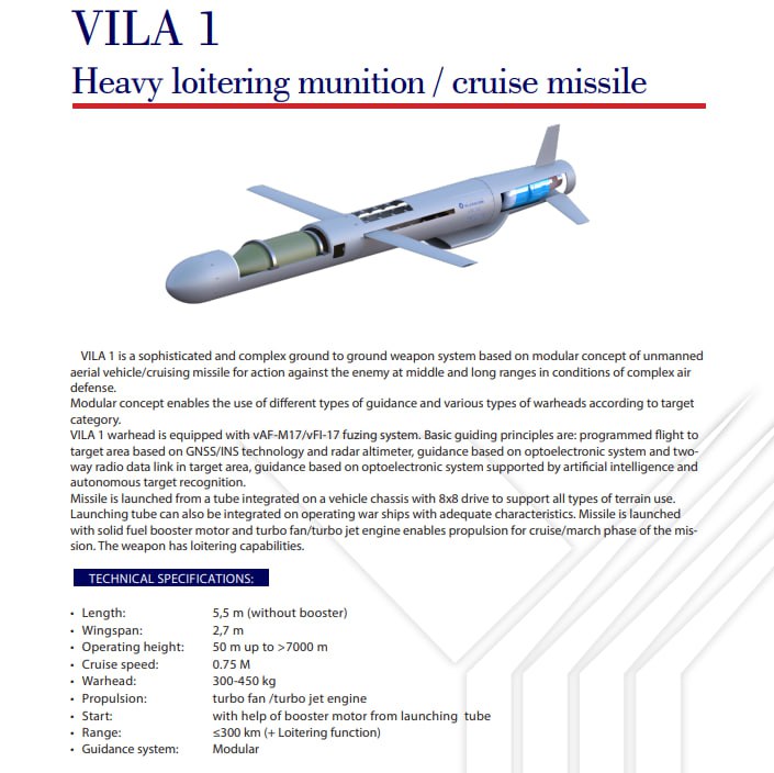 Η σερβική αμυντική εταιρεία Vlatacom, με έδρα το Βελιγράδι, ανακοίνωσε ότι τα νέα της βλήματα cruise, Vila‑1 και Vila‑2, έχουν ολοκληρωθεί κατά 80%, με την πλήρη ολοκλήρωση να αναμένεται έως το τέλος του έτους.